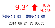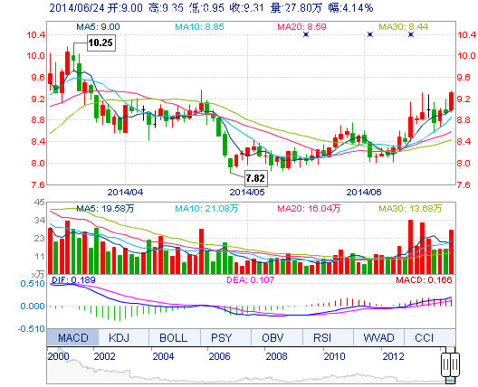 今开: 9.00 成交量: 27.80万手 振幅: 4.47% 最高: 9.35 成交额: 2.56亿元 换手率: 3.12% 最低: 8.95 总市值: 82.96亿 市净率: 3.10 昨收: 8.94 流通市值: 82...