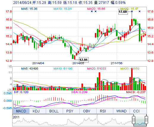 今开: 15.29 成交量: 2.79万手 振幅: 2.69% 最高: 15.59 成交额: 4295.11万元 换手率: 2.08% 最低: 15.18 总市值: 21.28亿 市净率: 6.22 昨收: 15.26 流通市...