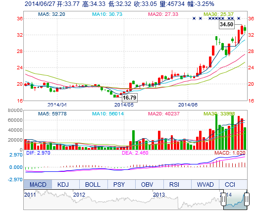 | 今 开: | 33.77 | 成交量: | 4.57万手 | 振 幅: | 5.88% |
