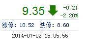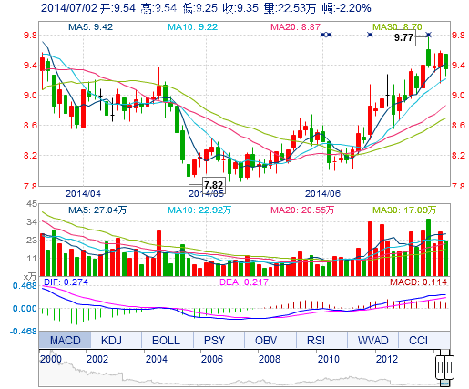 今开: 9.54 成交量: 22.53万手 振幅: 3.03% 最高: 9.54 成交额: 2.11亿元 换手率: 2.53% 最低: 9.25 总市值: 83.32亿 市净率: 3.11 昨收: 9.56 流通市值: 83...