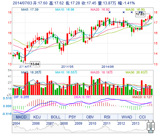 今开: 17.60 成交量: 13.87万手 振幅: 1.92% 最高: 17.62 成交额: 2.42亿元 换手率: 1.45% 最低: 17.28 总市值: 184.20亿 市净率: 5.00 昨收: 17.70 流通市值...