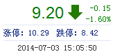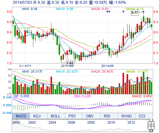 今开: 9.30 成交量: 19.58万手 振幅: 2.14% 最高: 9.30 成交额: 1.80亿元 换手率: 2.20% 最低: 9.10 总市值: 81.98亿 市净率: 3.06 昨收: 9.35 流通市值: 81...