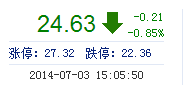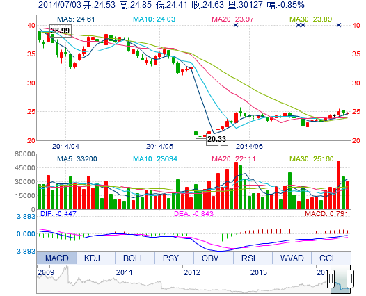 今开: 24.53 成交量: 3.01万手 振幅: 1.77% 最高: 24.85 成交额: 7424.01万元 换手率: 0.58% 最低: 24.41 总市值: 160.59亿 市净率: 6.12 昨收: 24.84 流通市...