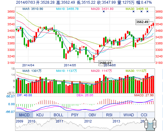 今开: 3528.28 最高: 3562.49 昨收: 3531.43 最低: 3515.23 成交量: 1275.06万手 振幅: 1.34% 成交额: 211.08亿元