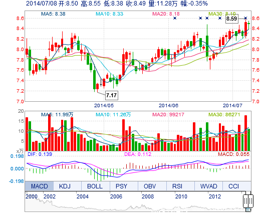 今开: 8.50 成交量: 11.28万手 振幅: 2.00% 最高: 8.55 成交额: 9531.42万元 换手率: 2.58% 最低: 8.38 总市值: 37.08亿 市净率: 2.66 昨收: 8.52 流通市值:...
