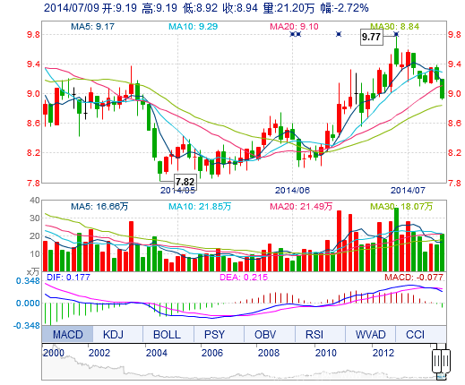 今开: 9.19 成交量: 21.20万手 振幅: 2.94% 最高: 9.19 成交额: 1.92亿元 换手率: 2.38% 最低: 8.92 总市值: 79.67亿 市净率: 2.98 昨收: 9.19 流通市值: 79...