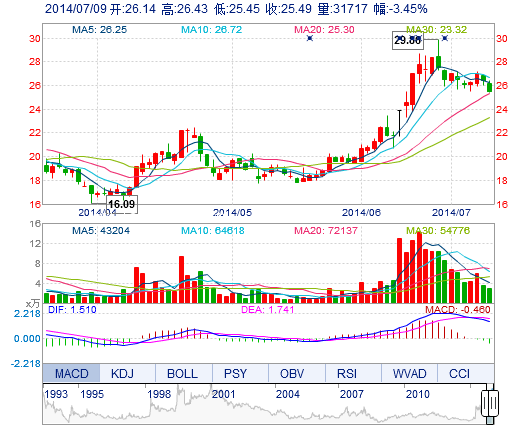 | 最 低: | 25.45 | 总市值: | 44.27亿 | 市净率: | 12.80 |