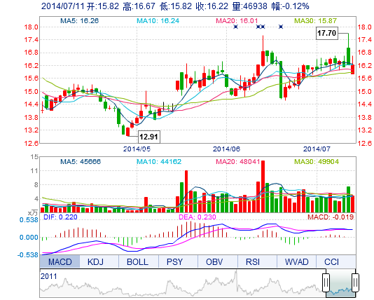 今开: 15.82 成交量: 4.69万手 振幅: 5.23% 最高: 16.67 成交额: 7666.83万元 换手率: 3.50% 最低: 15.82 总市值: 22.49亿 市净率: 6.57 昨收: 16.24 流通市...