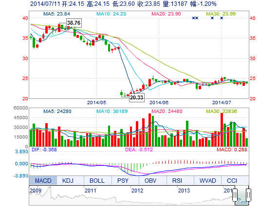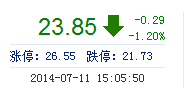 今开: 24.15 成交量: 1.32万手 振幅: 2.28% 最高: 24.15 成交额: 3153.86万元 换手率: 0.25% 最低: 23.60 总市值: 155.50亿 市净率: 5.93 昨收: 24.14 流通市...