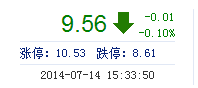 今开: 9.57 成交量: 24.86万手 振幅: 2.72% 最高: 9.59 成交额: 2.35亿元 换手率: 2.79% 最低: 9.33 总市值: 85.19亿 市净率: 3.18 昨收: 9.57 流通市值: 85...