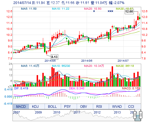 今开: 11.94 成交量: 11.04万手 振幅: 5.89% 最高: 12.37 成交额: 1.32亿元 换手率: 5.54% 最低: 11.66 总市值: 23.53亿 市净率: 4.75 昨收: 12.06 流通市值...