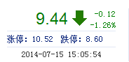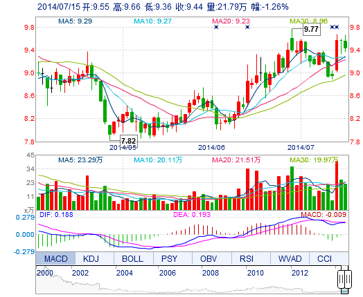 今开: 9.55 成交量: 21.79万手 振幅: 3.14% 最高: 9.66 成交额: 2.07亿元 换手率: 2.45% 最低: 9.36 总市值: 84.12亿 市净率: 3.14 昨收: 9.56 流通市值: 84...
