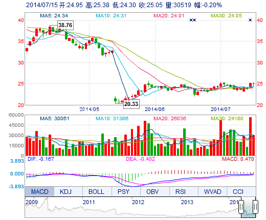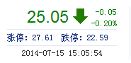 今开: 24.95 成交量: 3.05万手 振幅: 4.30% 最高: 25.38 成交额: 7613.65万元 换手率: 0.58% 最低: 24.30 总市值: 163.32亿 市净率: 6.23 昨收: 25.10 流通市...
