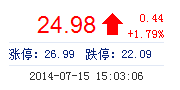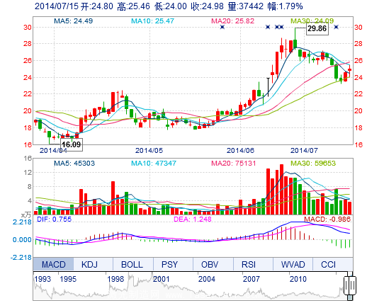 今开: 24.80 成交量: 3.74万手 振幅: 5.95% 最高: 25.46 成交额: 9315.56万元 换手率: 2.16% 最低: 24.00 总市值: 43.38亿 市净率: 12.55 昨收: 24.54 流通市...
