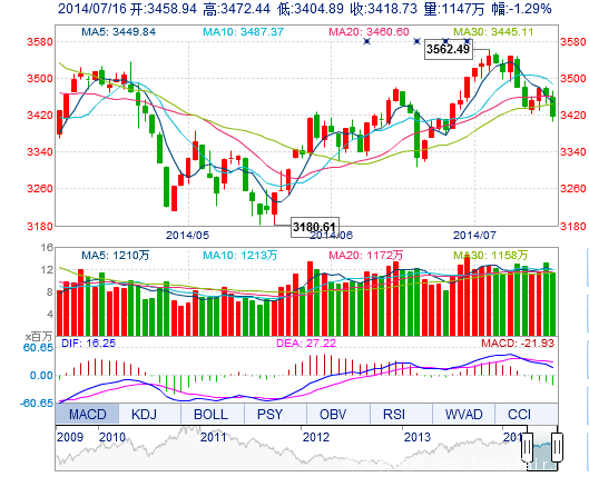 今开: 3458.94 最高: 3472.44 昨收: 3463.53 最低: 3404.89 成交量: 1147.25万手 振幅: 1.95% 成交额: 180.08亿元