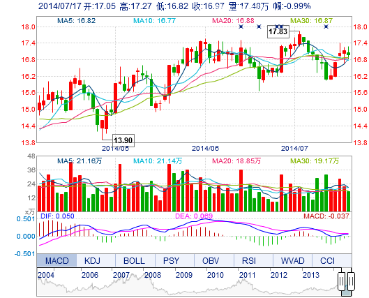 今开: 17.05 成交量: 17.48万手 振幅: 2.63% 最高: 17.27 成交额: 2.98亿元 换手率: 1.83% 最低: 16.82 总市值: 179.13亿 市净率: 4.86 昨收: 17.14 流通市值...