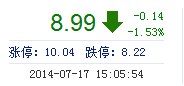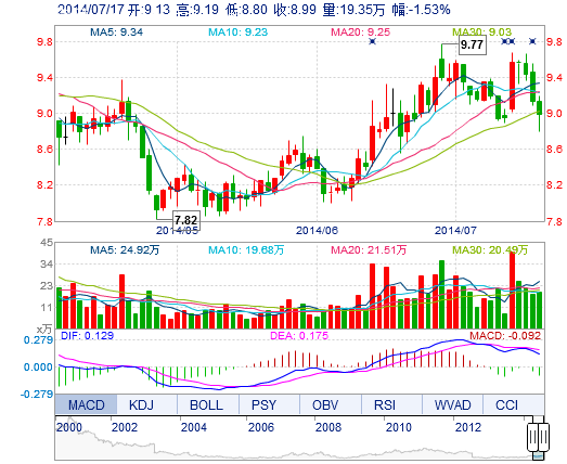 今开: 9.13 成交量: 19.35万手 振幅: 4.27% 最高: 9.19 成交额: 1.74亿元 换手率: 2.17% 最低: 8.80 总市值: 80.11亿 市净率: 2.99 昨收: 9.13 流通市值: 80...