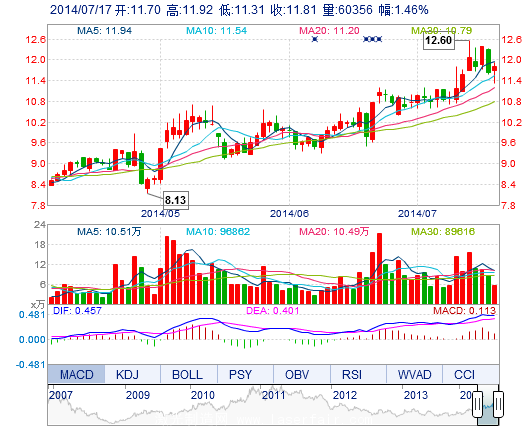今开: 11.70 成交量: 6.04万手 振幅: 5.24% 最高: 11.92 成交额: 7053.93万元 换手率: 3.03% 最低: 11.31 总市值: 23.53亿 市净率: 4.75 昨收: 11.64 流通市...