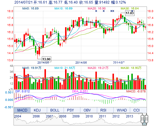 今开: 16.61 成交量: 9.15万手 振幅: 2.22% 最高: 16.77 成交额: 1.52亿元 换手率: 0.96% 最低: 16.40 总市值: 175.75亿 市净率: 4.77 昨收: 16.63 流通市值...