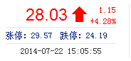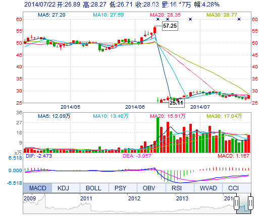 今开: 26.89 成交量: 16.17万手 振幅: 5.80% 最高: 28.27 成交额: 4.45亿元 换手率: 2.55% 最低: 26.71 总市值: 183.56亿 市净率: 5.02 昨收: 26.88 流通市值...