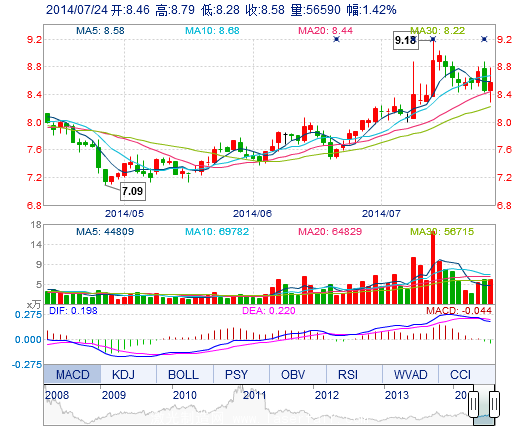 | 最 高: | 8.79 | 成交额: | 4818.41万元 | 换手率: | 2.06% |