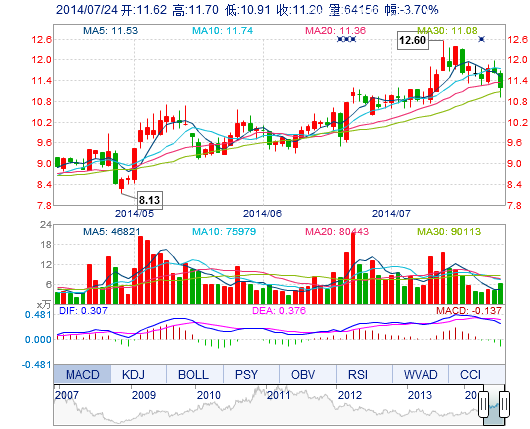 今开: 11.62 成交量: 6.42万手 振幅: 6.79% 最高: 11.70 成交额: 7189.92万元 换手率: 3.22% 最低: 10.91 总市值: 22.31亿 市净率: 4.50 昨收: 11.63 流通市...
