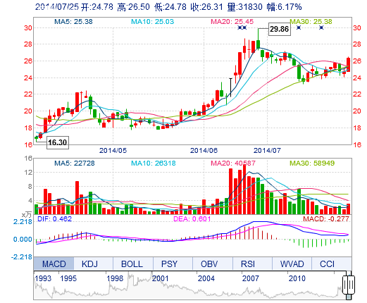 今开: 24.78 成交量: 3.18万手 振幅: 6.94% 最高: 26.50 成交额: 8280.61万元 换手率: 1.83% 最低: 24.78 总市值: 45.69亿 市净率: 13.21 昨收: 24.78 流通市...