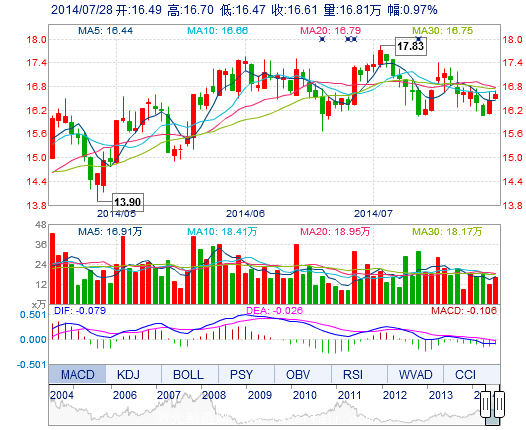 今开: 16.49 成交量: 16.81万手 振幅: 1.40% 最高: 16.70 成交额: 2.79亿元 换手率: 1.76% 最低: 16.47 总市值: 175.33亿 市净率: 4.76 昨收: 16.45 流通市值...
