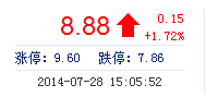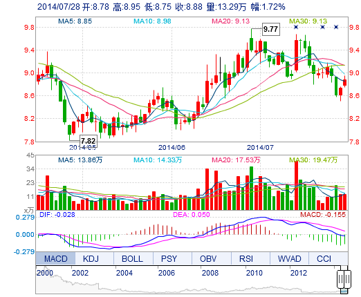 今开: 8.78 成交量: 13.29万手 振幅: 2.29% 最高: 8.95 成交额: 1.18亿元 换手率: 1.49% 最低: 8.75 总市值: 79.13亿 市净率: 2.96 昨收: 8.73 流通市值: 79...