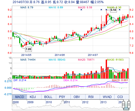 | 最 高: | 8.95 | 成交额: | 7815.54万元 | 换手率: | 3.22% |