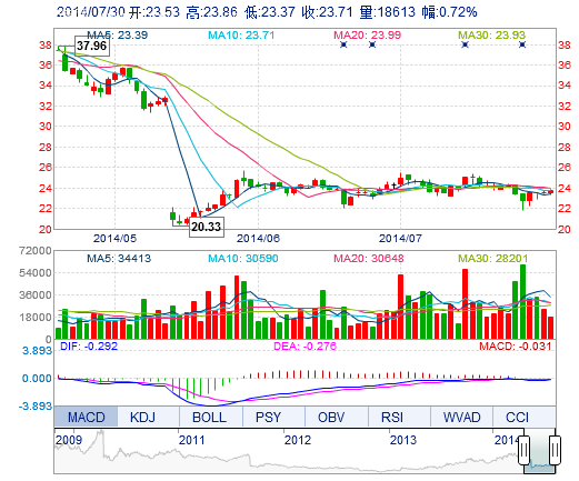 今开: 23.53 成交量: 1.86万手 振幅: 2.08% 最高: 23.86 成交额: 4397.42万元 换手率: 0.36% 最低: 23.37 总市值: 154.59亿 市净率: 5.89 昨收: 23.54 流通市...