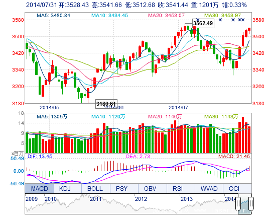 今开: 3528.43 最高: 3541.66 昨收: 3529.76 最低: 3512.68 成交量: 1200.97万手 振幅: 0.82% 成交额: 187.44亿元