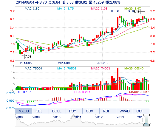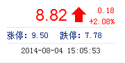 | 最 高: | 8.84 | 成交额: | 3797.40万元 | 换手率: | 1.57% |