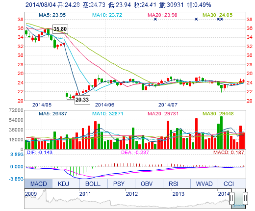 今开: 24.28 成交量: 3.09万手 振幅: 3.25% 最高: 24.73 成交额: 7523.26万元 换手率: 0.59% 最低: 23.94 总市值: 159.15亿 市净率: 6.07 昨收: 24.29 流通市...