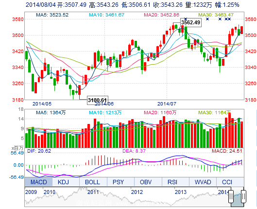 今开: 3507.49 最高: 3543.26 昨收: 3499.57 最低: 3506.61 成交量: 1232.36万手 振幅: 1.05% 成交额: 186.24亿元