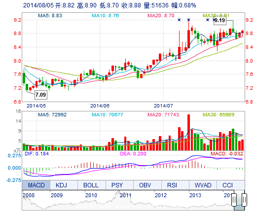 今开: 8.82 成交量: 5.16万手 振幅: 2.27% 最高: 8.90 成交额: 4544.70万元 换手率: 1.88% 最低: 8.70 总市值: 25.31亿 市净率: 3.94 昨收: 8.82 流通市值: ...