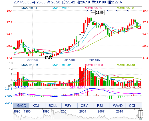 今开: 25.65 成交量: 3.31万手 振幅: 3.05% 最高: 26.20 成交额: 8535.39万元 换手率: 1.91% 最低: 25.42 总市值: 45.47亿 市净率: 13.15 昨收: 25.60 流通市...