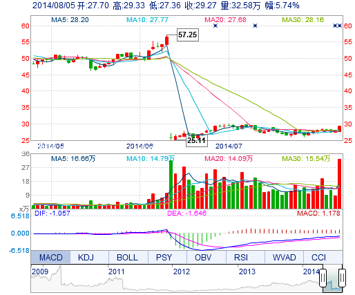 今开: 27.70 成交量: 32.58万手 振幅: 7.12% 最高: 29.33 成交额: 9.33亿元 换手率: 5.14% 最低: 27.36 总市值: 191.68亿 市净率: 11.27 昨收: 27.68 流通市...