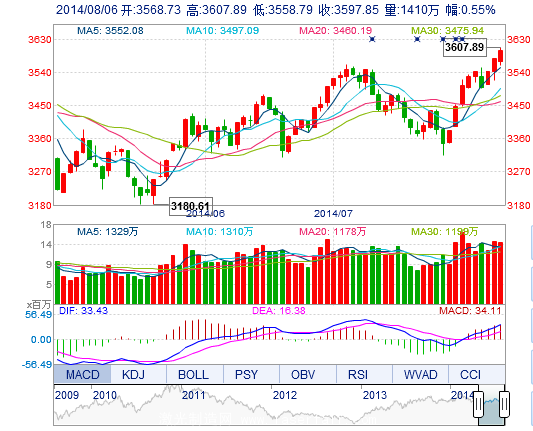 今开: 3568.73 最高: 3607.89 昨收: 3578.27 最低: 3558.79 成交量: 1410.09万手 振幅: 1.37% 成交额: 207.21亿元