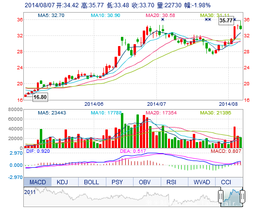 | 最 高: | 35.77 | 成交额: | 7812.58万元 | 换手率: | 8.52% |