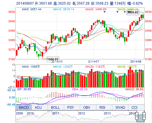 今开: 3601.88 最高: 3625.02 昨收: 3597.85 最低: 3567.28 成交量: 1347.60万手 振幅: 1.60% 成交额: 204.70亿元