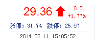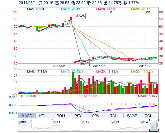 今开: 29.15 成交量: 14.75万手 振幅: 2.29% 最高: 29.58 成交额: 4.33亿元 换手率: 2.33% 最低: 28.92 总市值: 192.26亿 市净率: 11.31 昨收: 28.85 流通市...