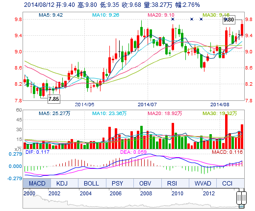 今开: 9.40 成交量: 38.27万手 振幅: 4.78% 最高: 9.80 成交额: 3.68亿元 换手率: 4.29% 最低: 9.35 总市值: 86.26亿 市净率: 3.22 昨收: 9.42 流通市值: 86...