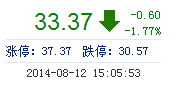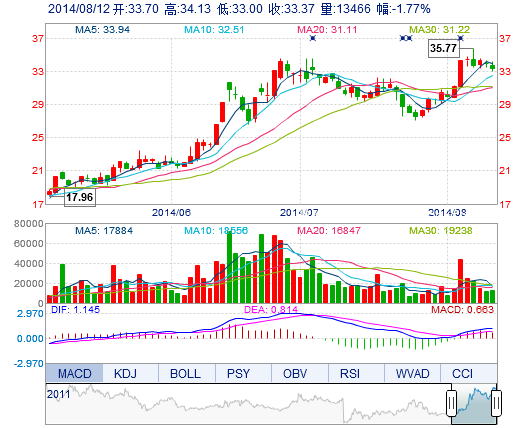 | 今 开: | 33.70 | 成交量: | 1.35万手 | 振 幅: | 3.33% |