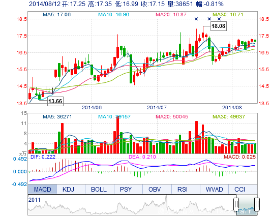 | 最 高: | 17.35 | 成交额: | 6627.46万元 | 换手率: | 2.88% |