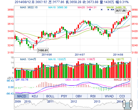 今开: 3663.82 最高: 3677.86 昨收: 3662.68 最低: 3658.28 成交量: 1435.99万手 振幅: 0.53% 成交额: 228.05亿元