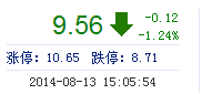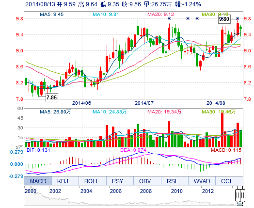 今开: 9.59 成交量: 26.75万手 振幅: 3.00% 最高: 9.64 成交额: 2.54亿元 换手率: 3.00% 最低: 9.35 总市值: 85.19亿 市净率: 3.18 昨收: 9.68 流通市值: 85...