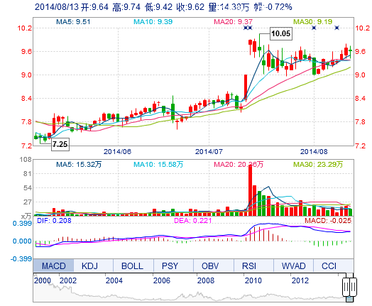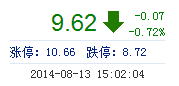 今开: 9.64 成交量: 14.38万手 振幅: 3.30% 最高: 9.74 成交额: 1.38亿元 换手率: 3.29% 最低: 9.42 总市值: 42.02亿 市净率: 3.02 昨收: 9.69 流通市值: 42...