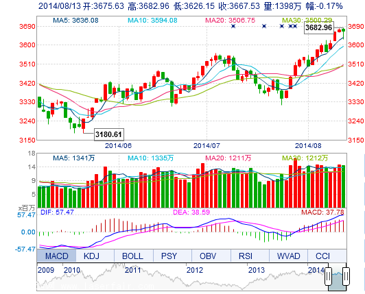 今开: 3675.63 最高: 3682.96 昨收: 3673.88 最低: 3626.15 成交量: 1398.49万手 振幅: 1.55% 成交额: 235.11亿元