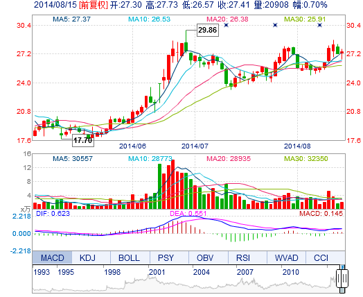 今开: 27.30 成交量: 2.09万手 振幅: 4.26% 最高: 27.73 成交额: 5643.72万元 换手率: 1.20% 最低: 26.57 总市值: 47.60亿 市净率: 13.77 昨收: 27.22 流通市...